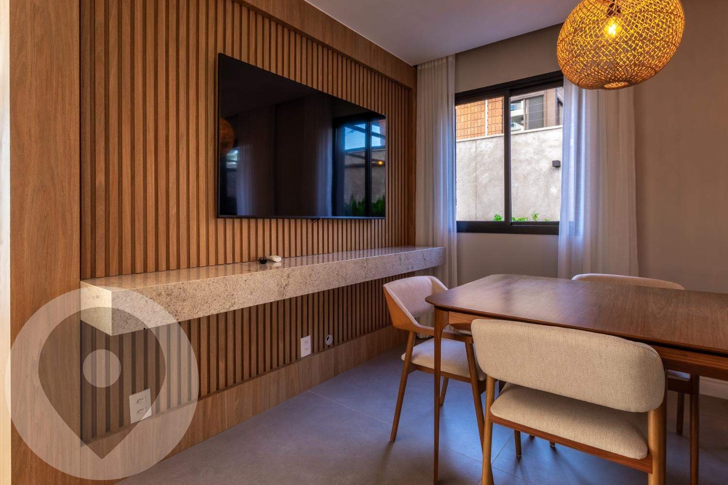 Apartamento com 1 dormitório suíte, lavabo, sala de jantar, sala de estar, cozinha, área de serviço e