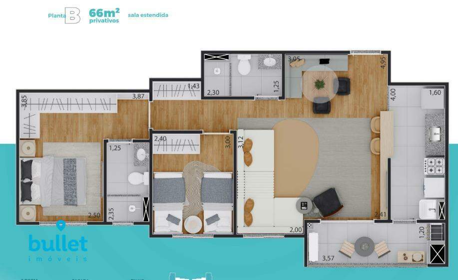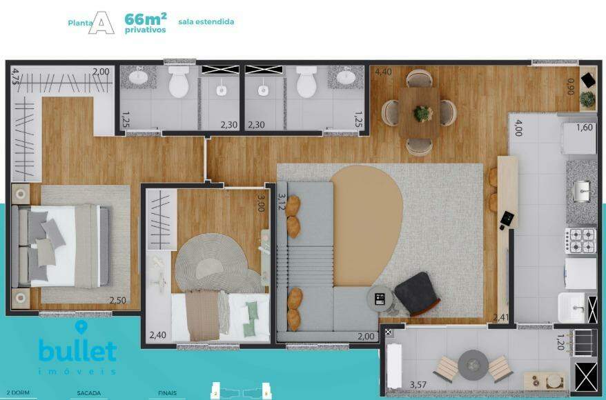 Os apartamentos possuem 66 m², com 2 dormitórios sendo 1 suíte, além de sala integrada à varanda gourmet com churrasqueira, proporcionando um ambiente moderno e funcional para o dia a dia. A planta conta ainda com cozinha bem distribuída e 1 ou 2 vagas de garagem.