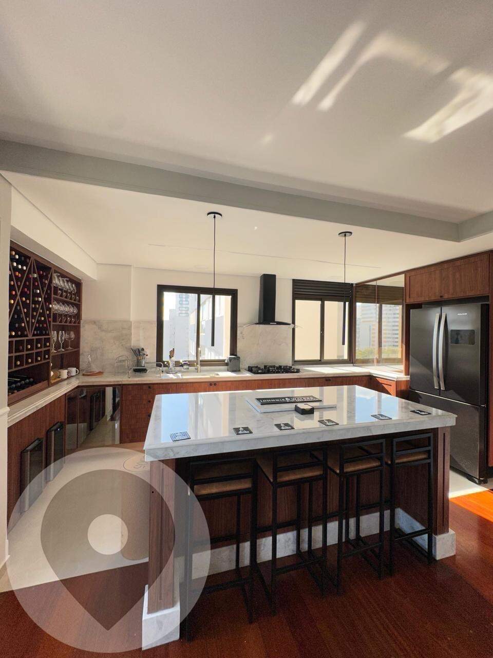 Cozinha planejada com ilha central e acabamento premium ? armários com portas de vidro e puxadores rosê, assim como nas suítes.