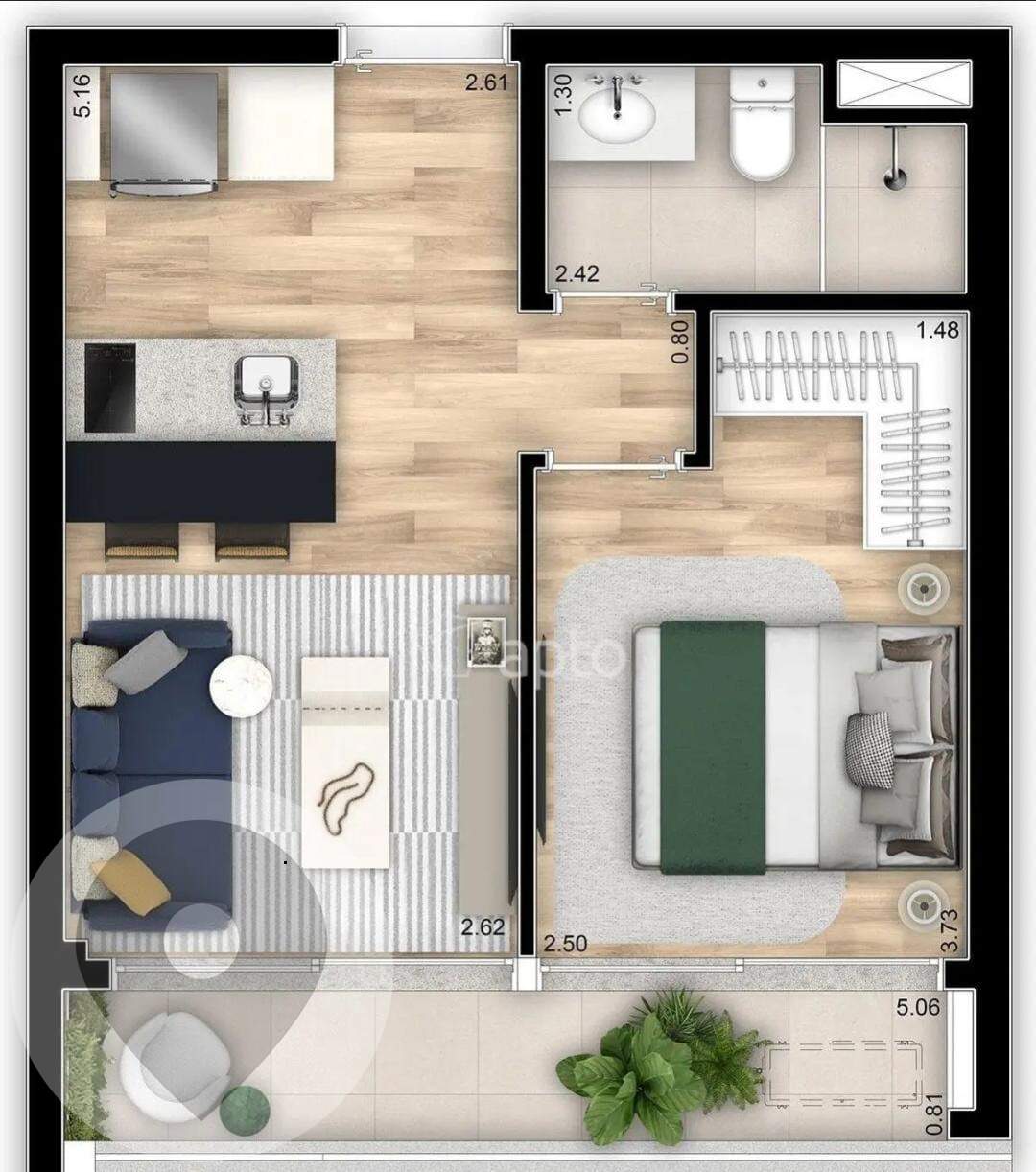 Sendo um dormitório, sala,cozinha, banheiro social, espaço para escritório e uma vaga de garagem.