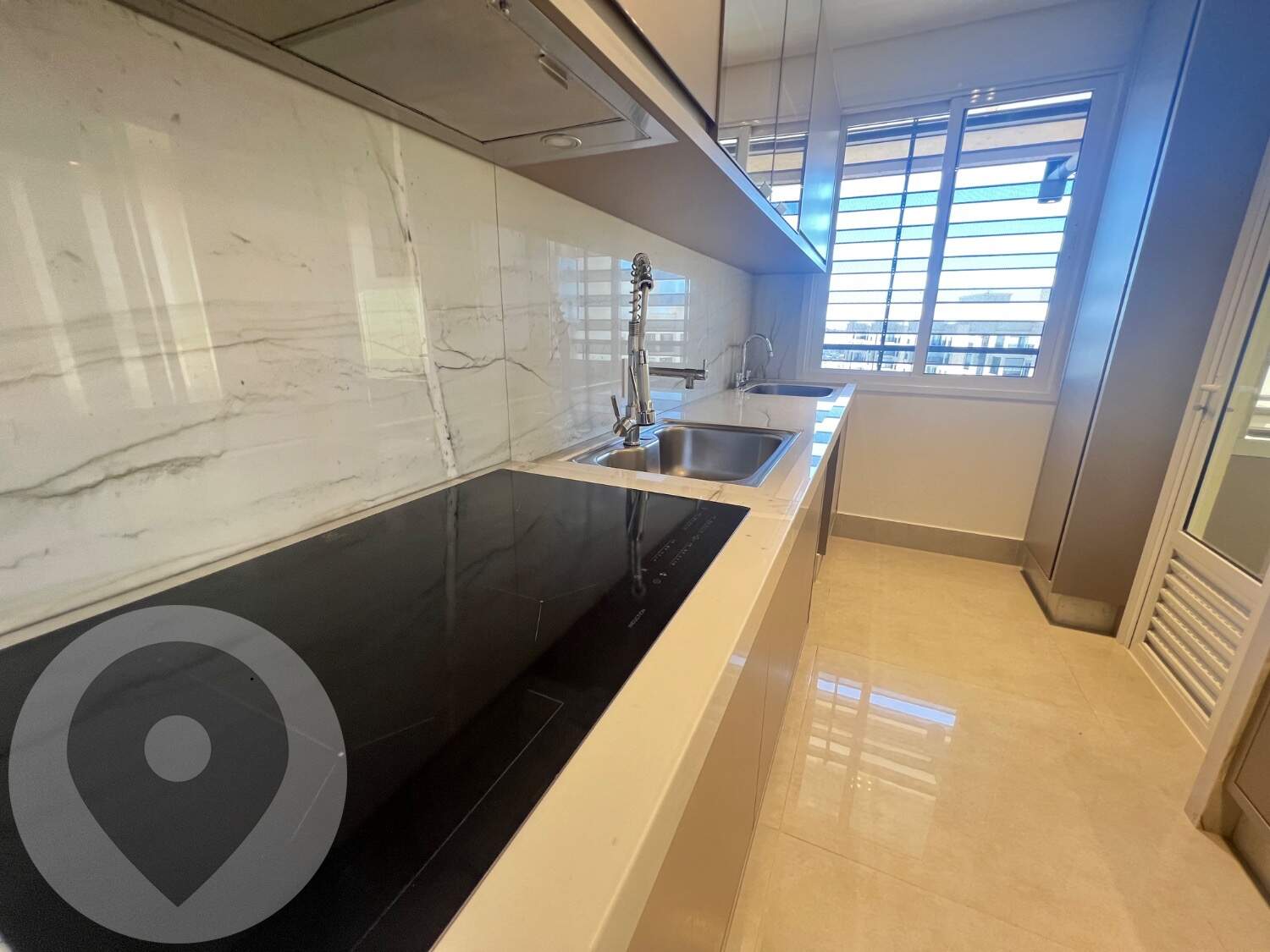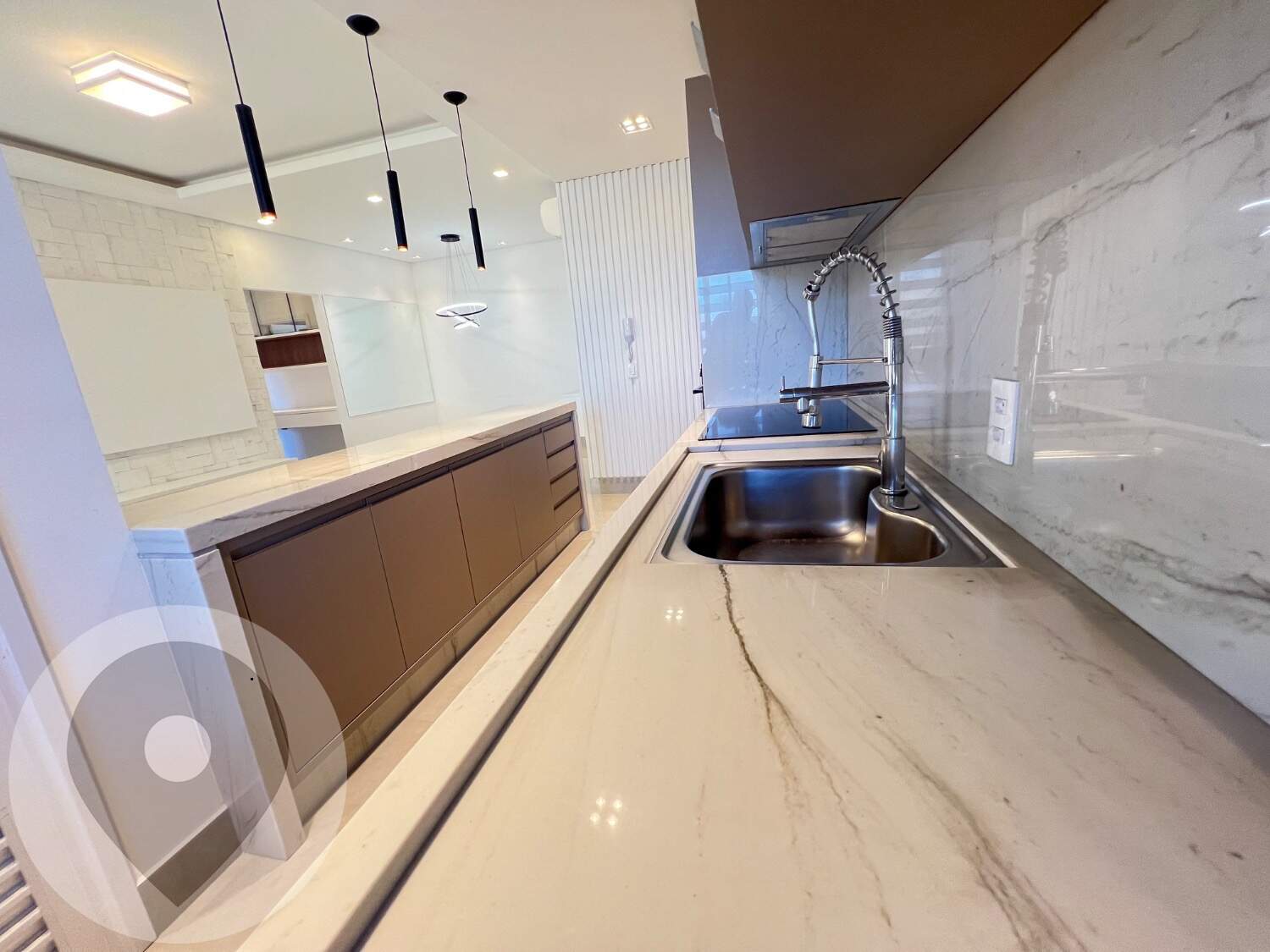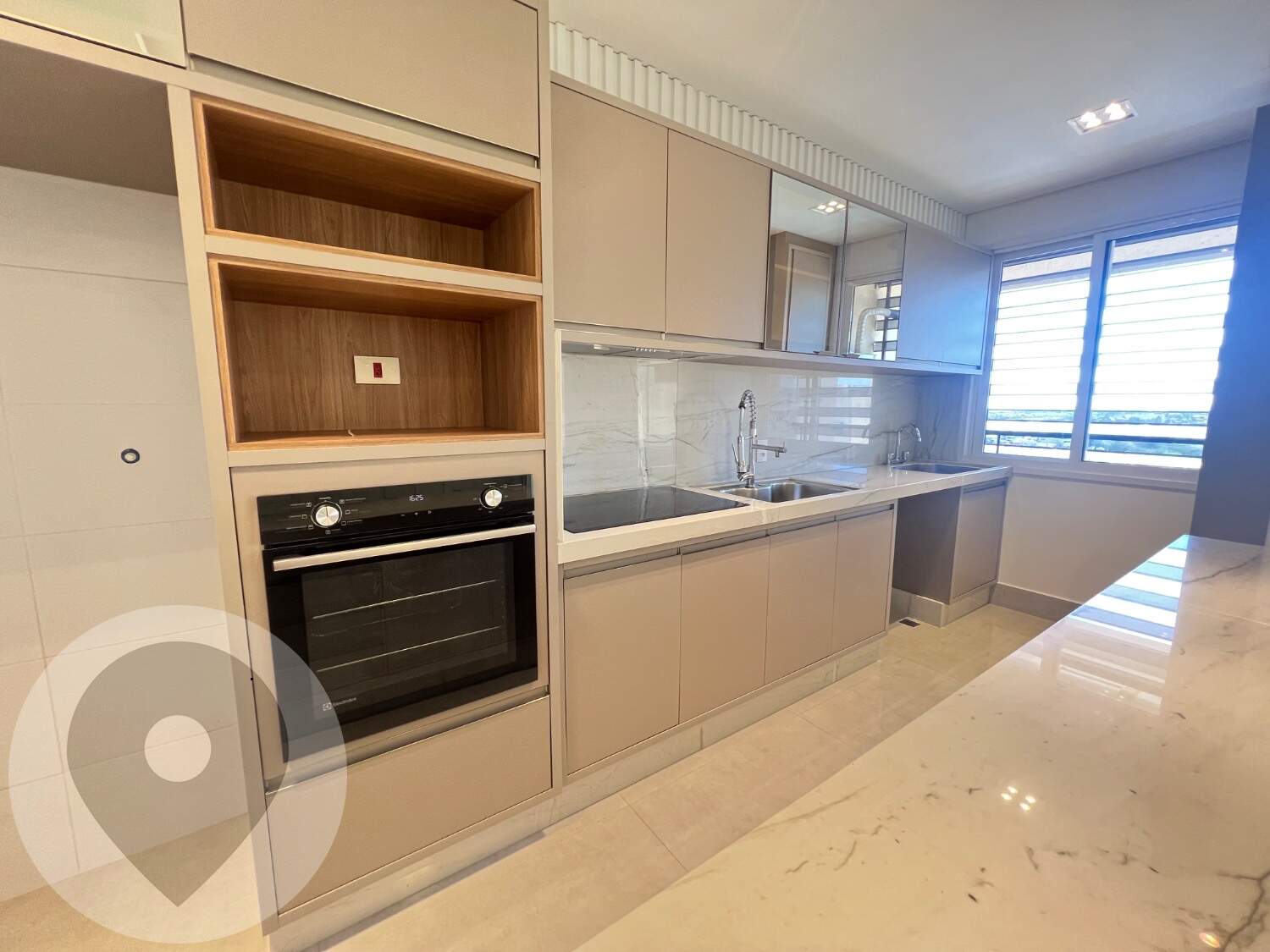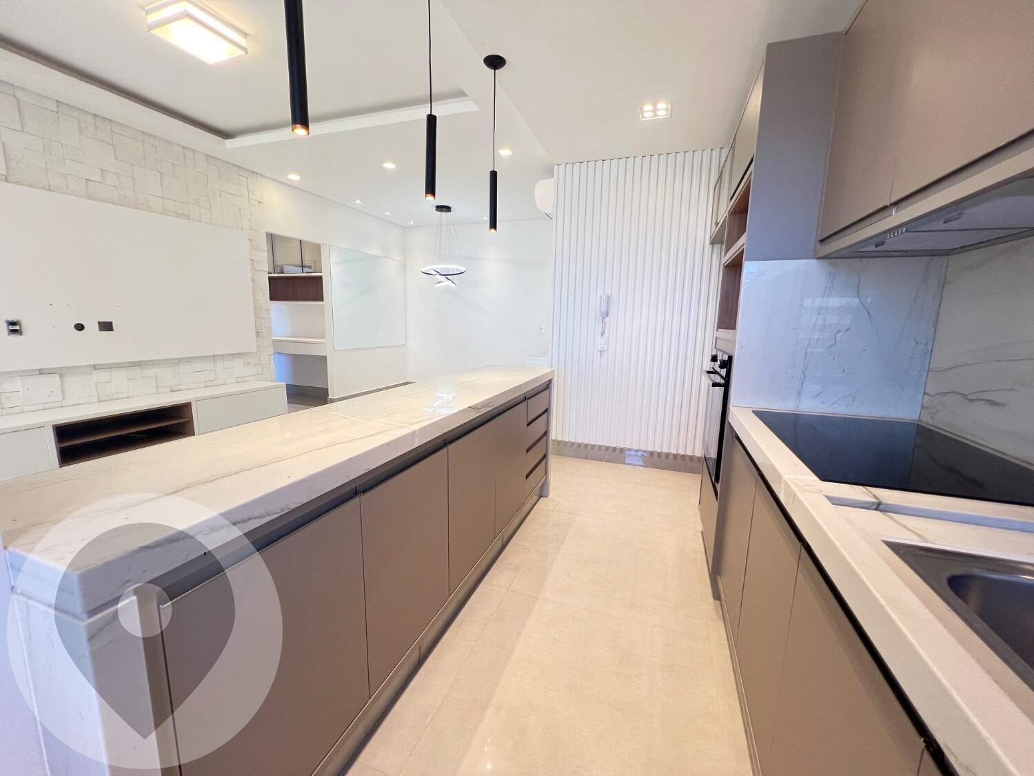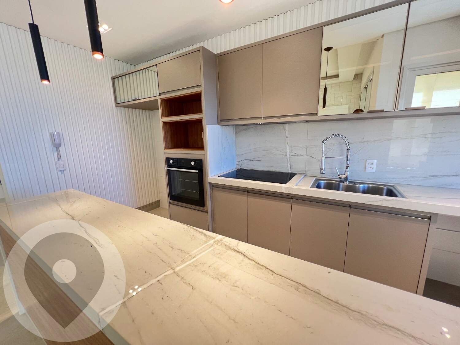 Cozinha planejada com cooktop, coifa e forno embutido
