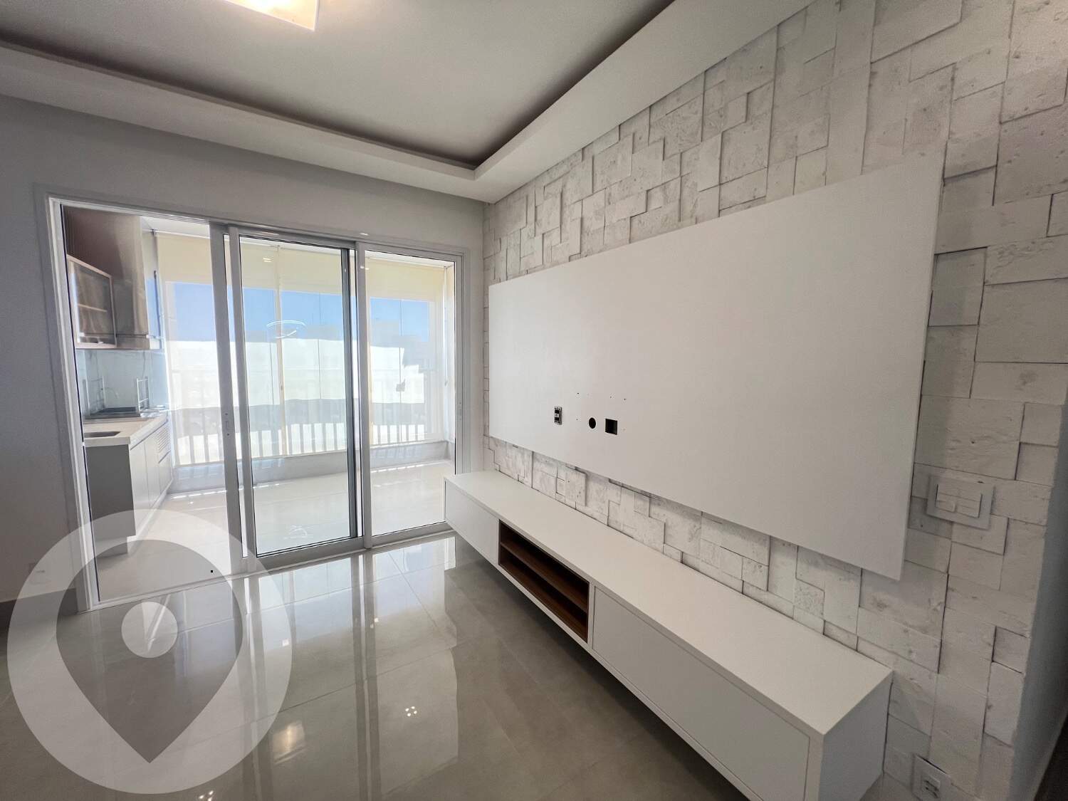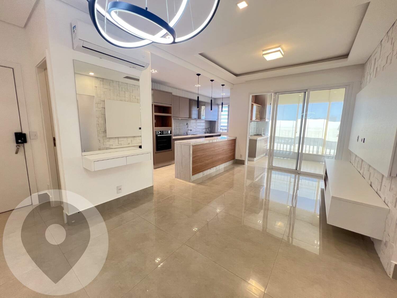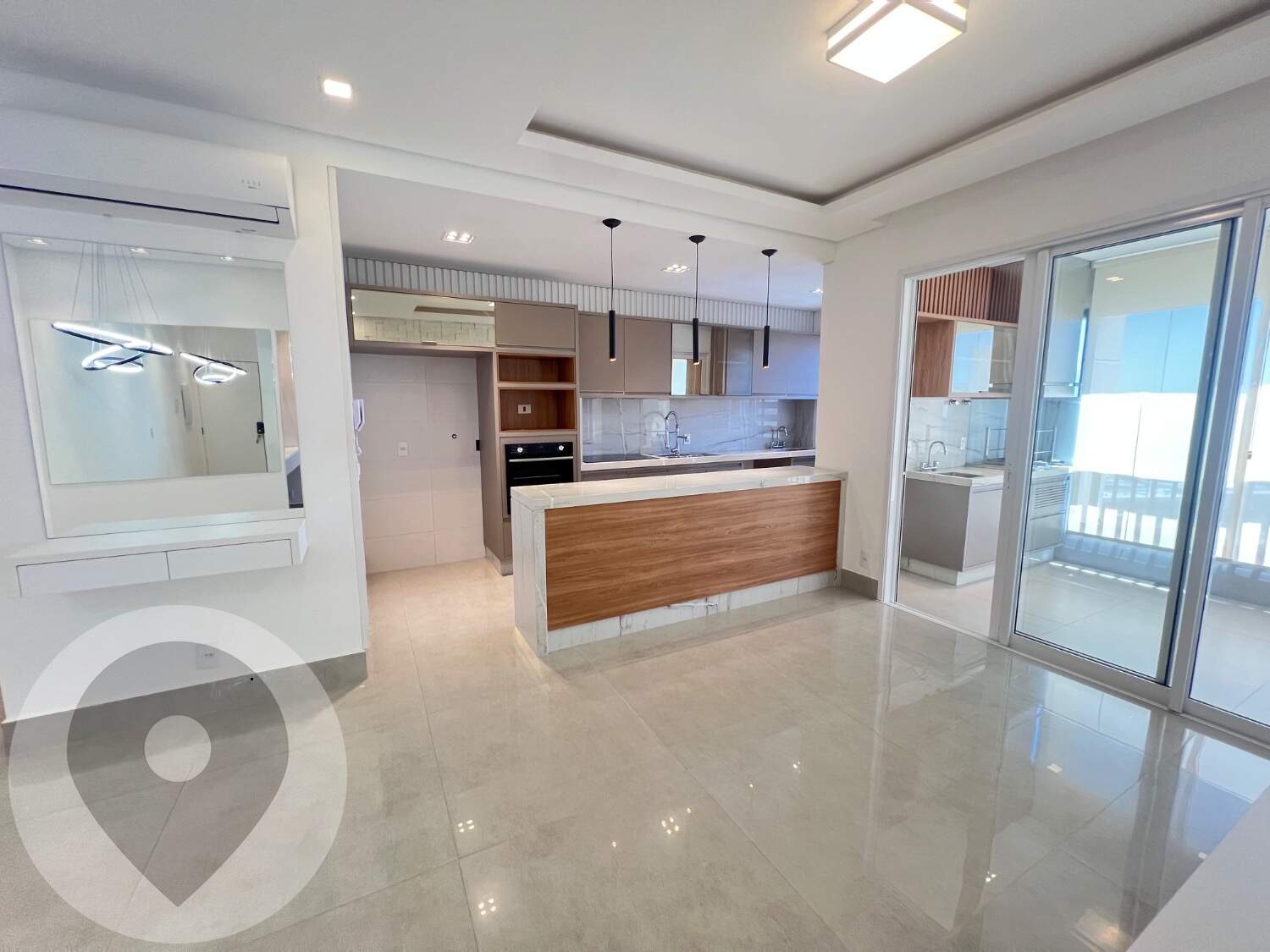 Sala ampla e climatizada, integrada à varanda gourmet com fechamento em vidro