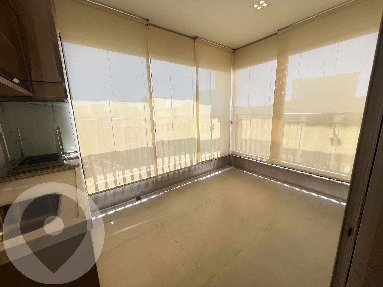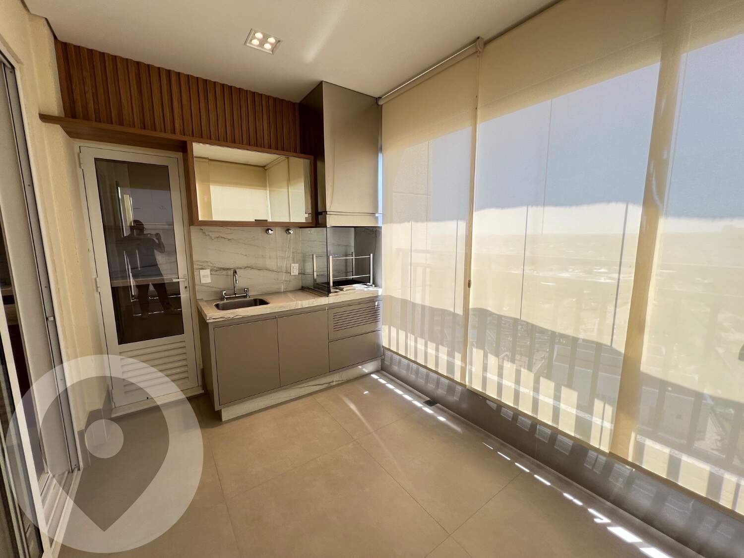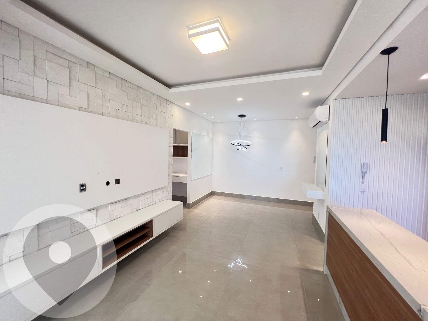 Sala ampla e climatizada, integrada à varanda gourmet com fechamento em vidro