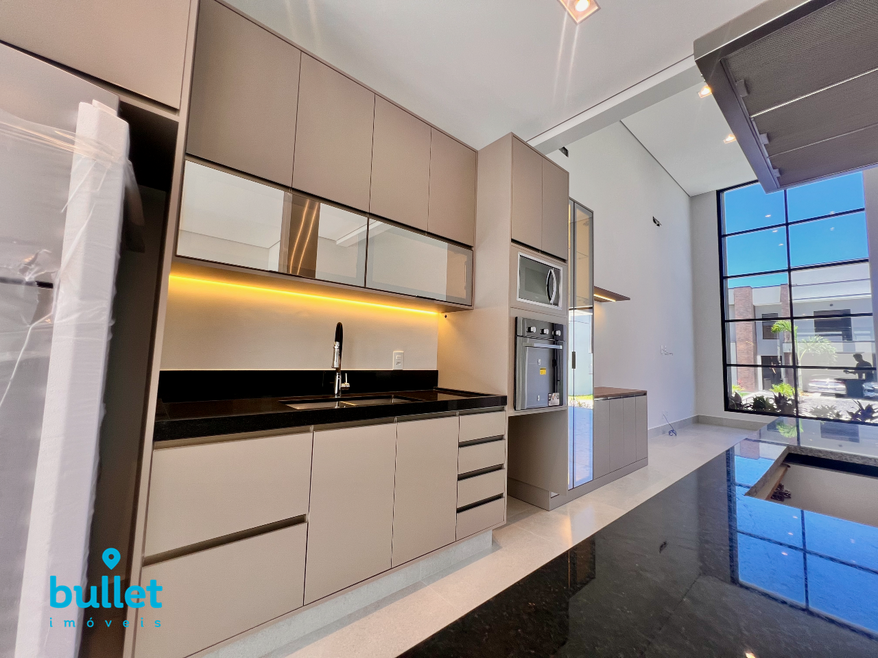 Cozinha planejada completa com geladeira, forno elétrico, micro-ondas, cooktop e coifa