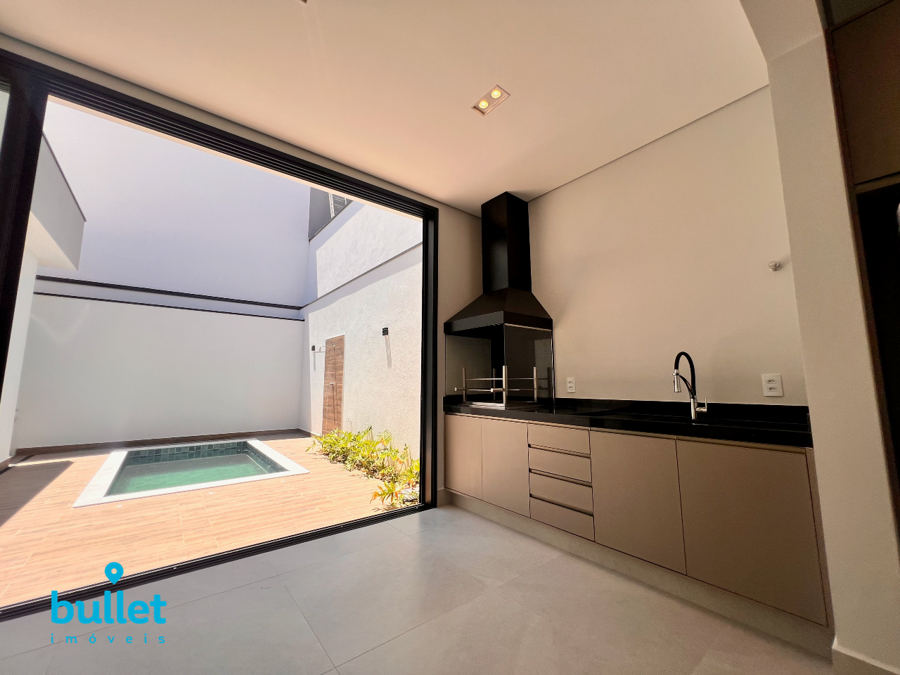 Espaço gourmet com marcenaria planejada e churrasqueira