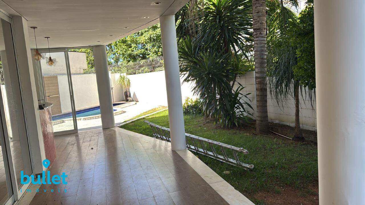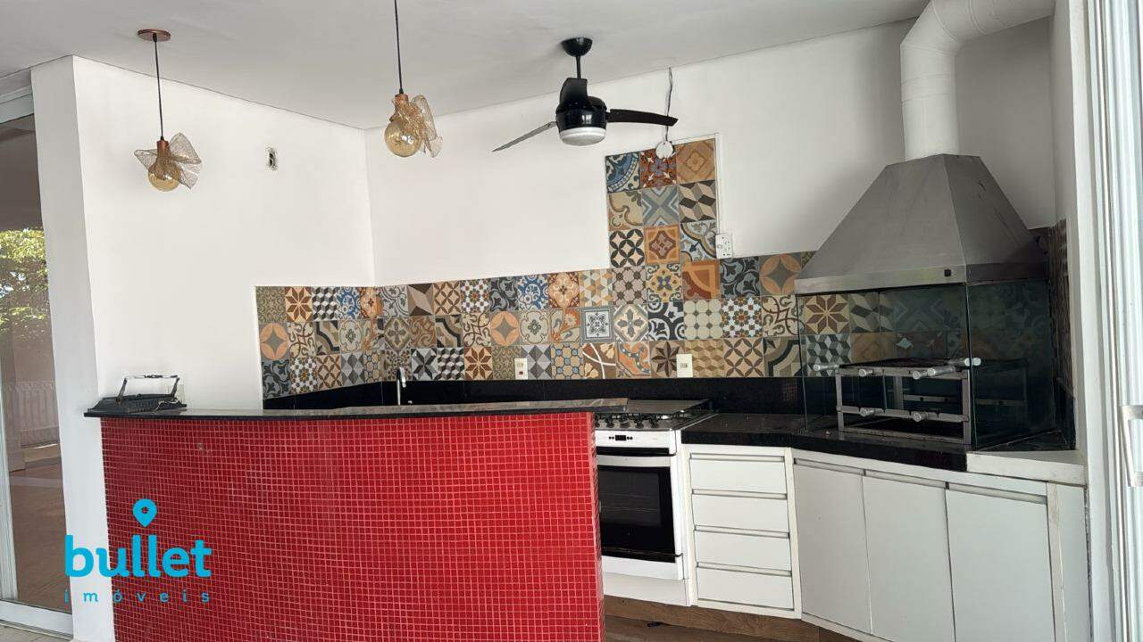 Varanda gourmet com churrasqueira, e piscina com cascata
