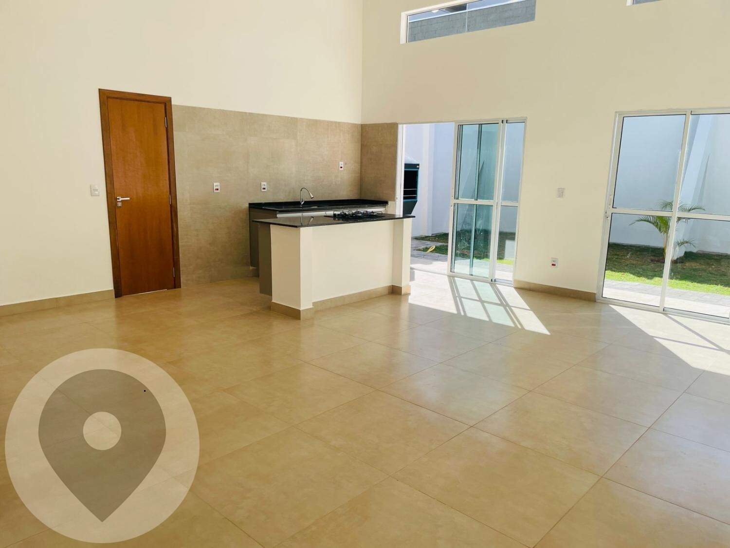 Sala ampla e bem iluminada, com pé direito alto, integrando sala de estar, sala de jantar e cozinha.