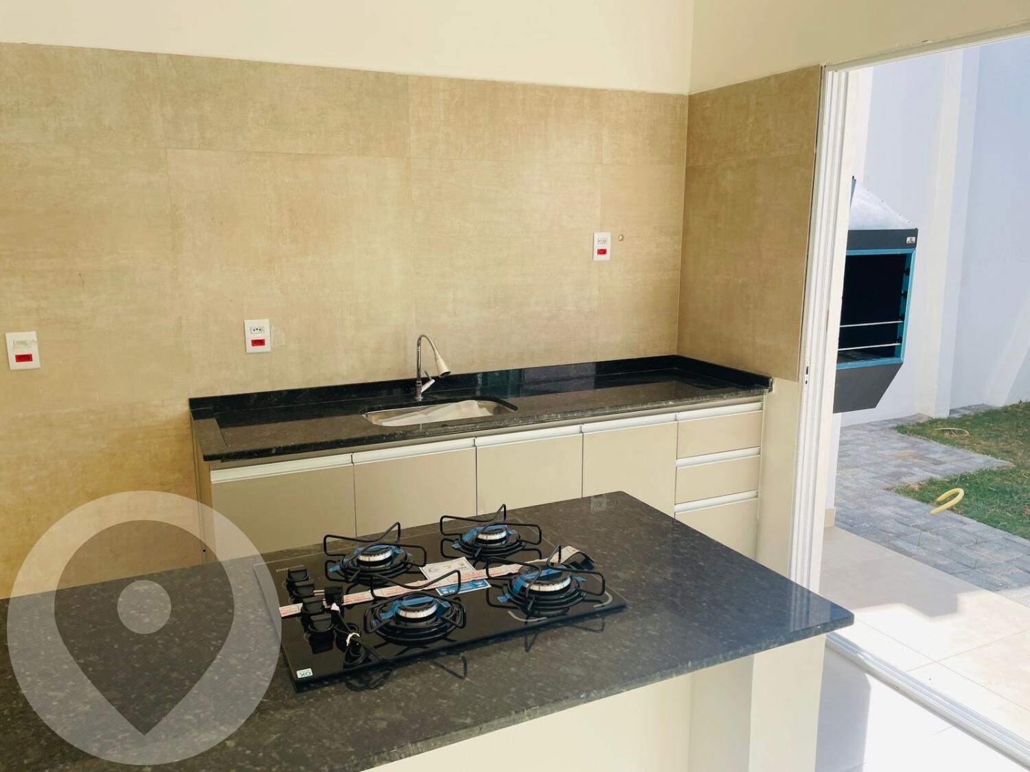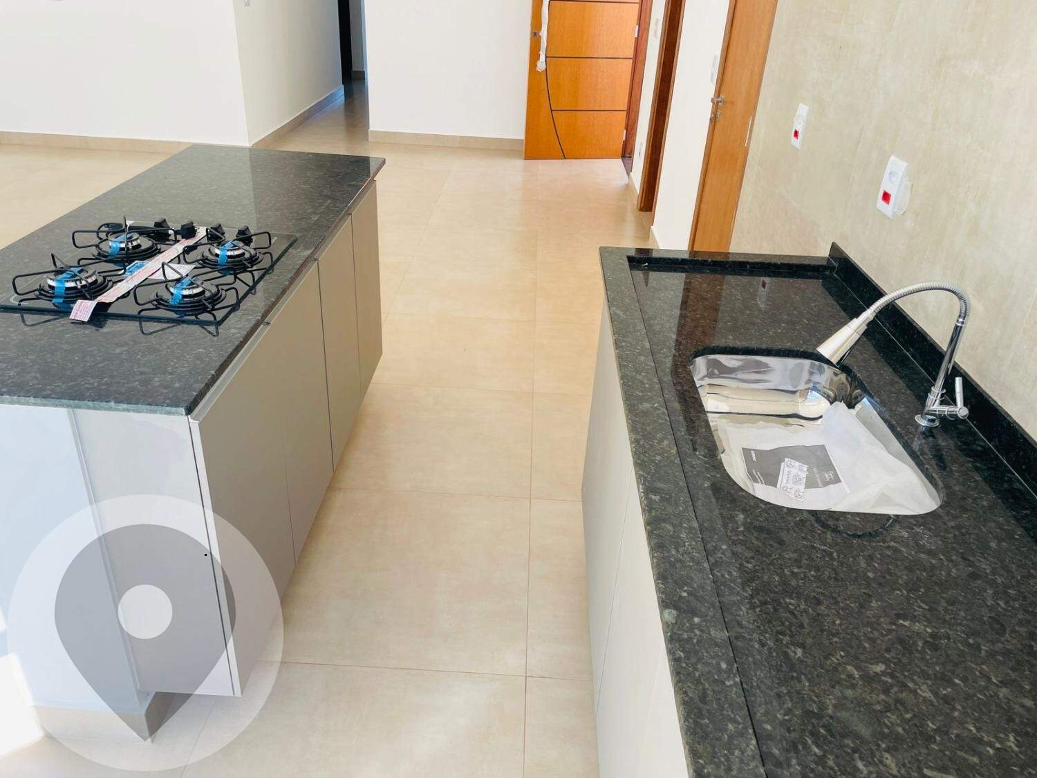 Gabinete na pia da cozinha e balcão com cooktop já instalados.