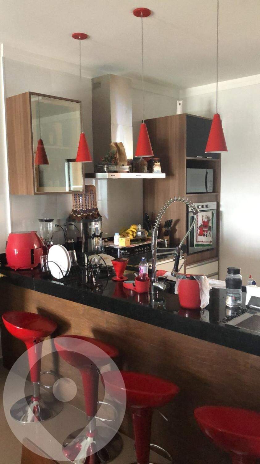Cozinha integrada , piso tipo porcelanato, torneira mono comando gourmet, bancada em granito preto com 1 cuba inox, armários em MDF branco sob a pia e bancadas internas, cooktop embutido 5 bocas Philco, coifa , revestimento tipo porcelanato acima do cooktop, forno elétrico Brastemp , armários em MDF branco e madeirado ao lado da instalação (torre)da geladeira e sobre a instalação (torre) espaço para geladeira;