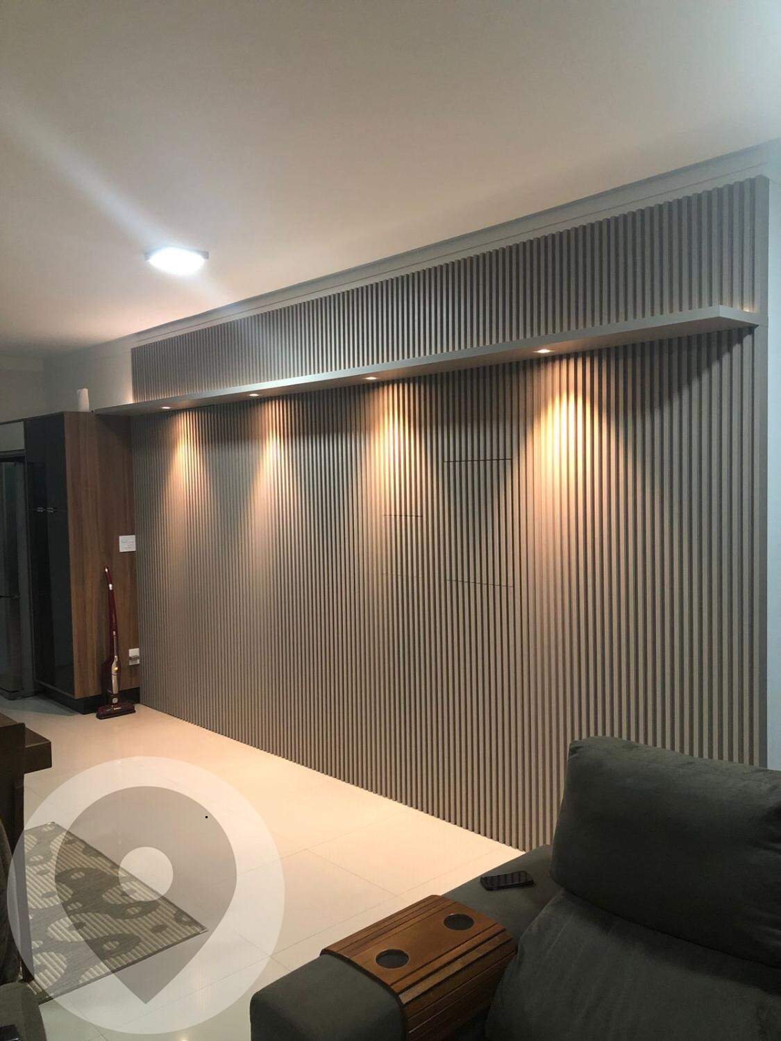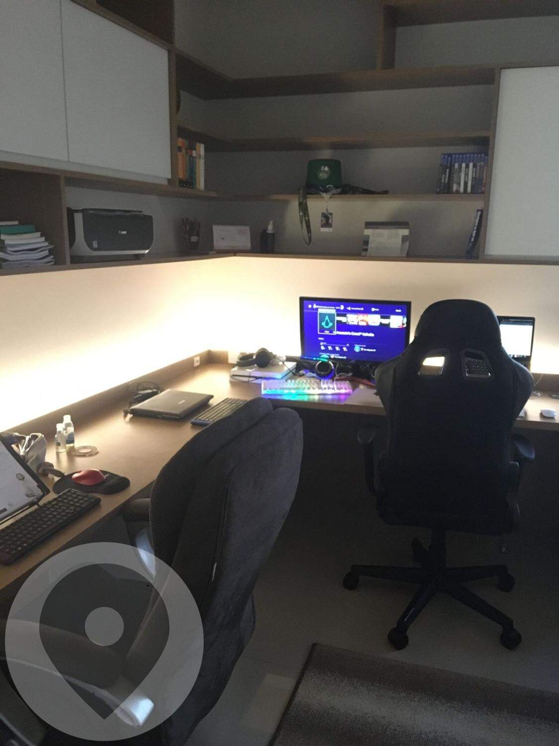 Salas (2 ambientes compartilhados), piso porcelanato, luzes embutidas no teto(sanca) com spots, LEDs e Lustre;