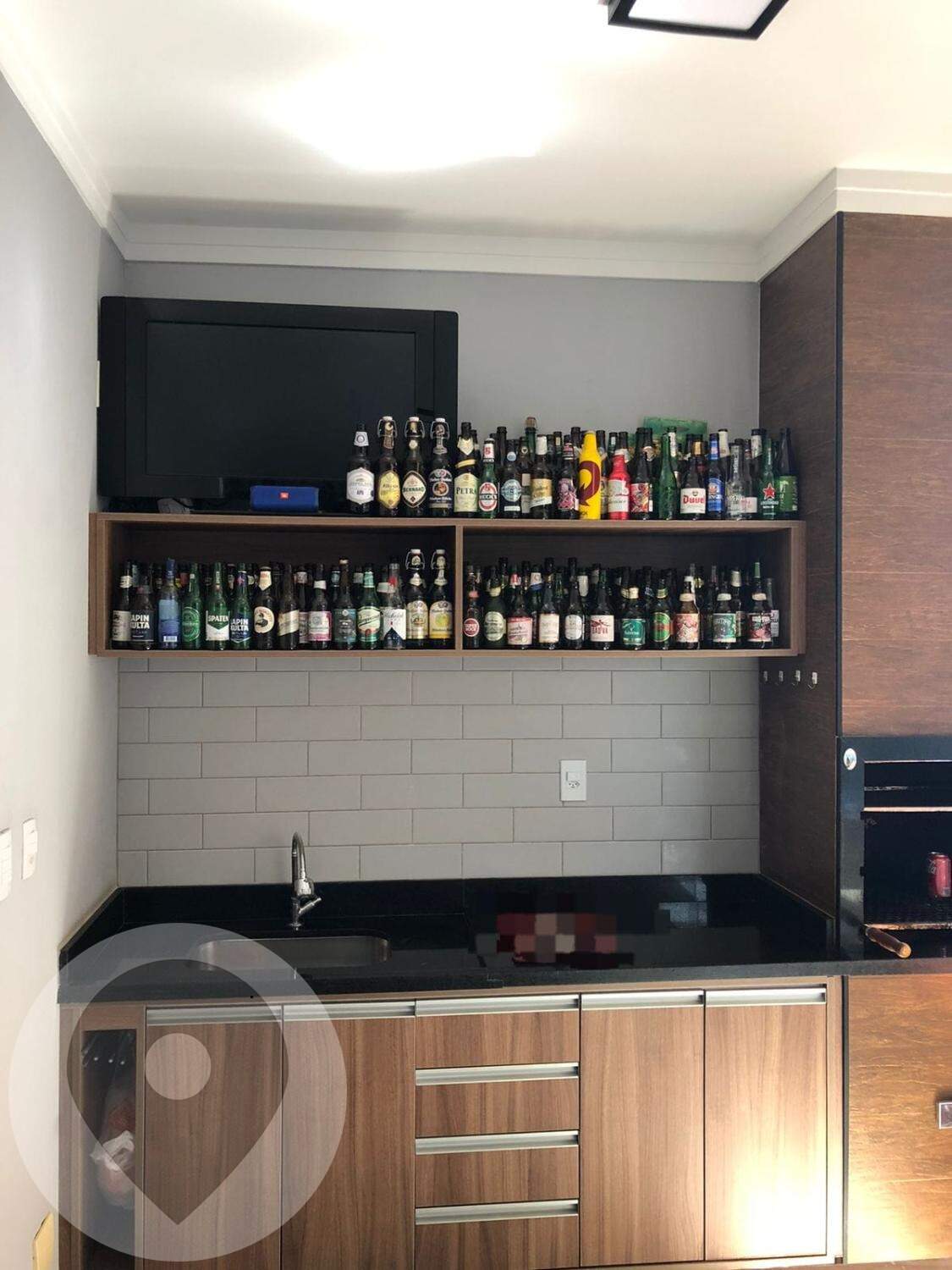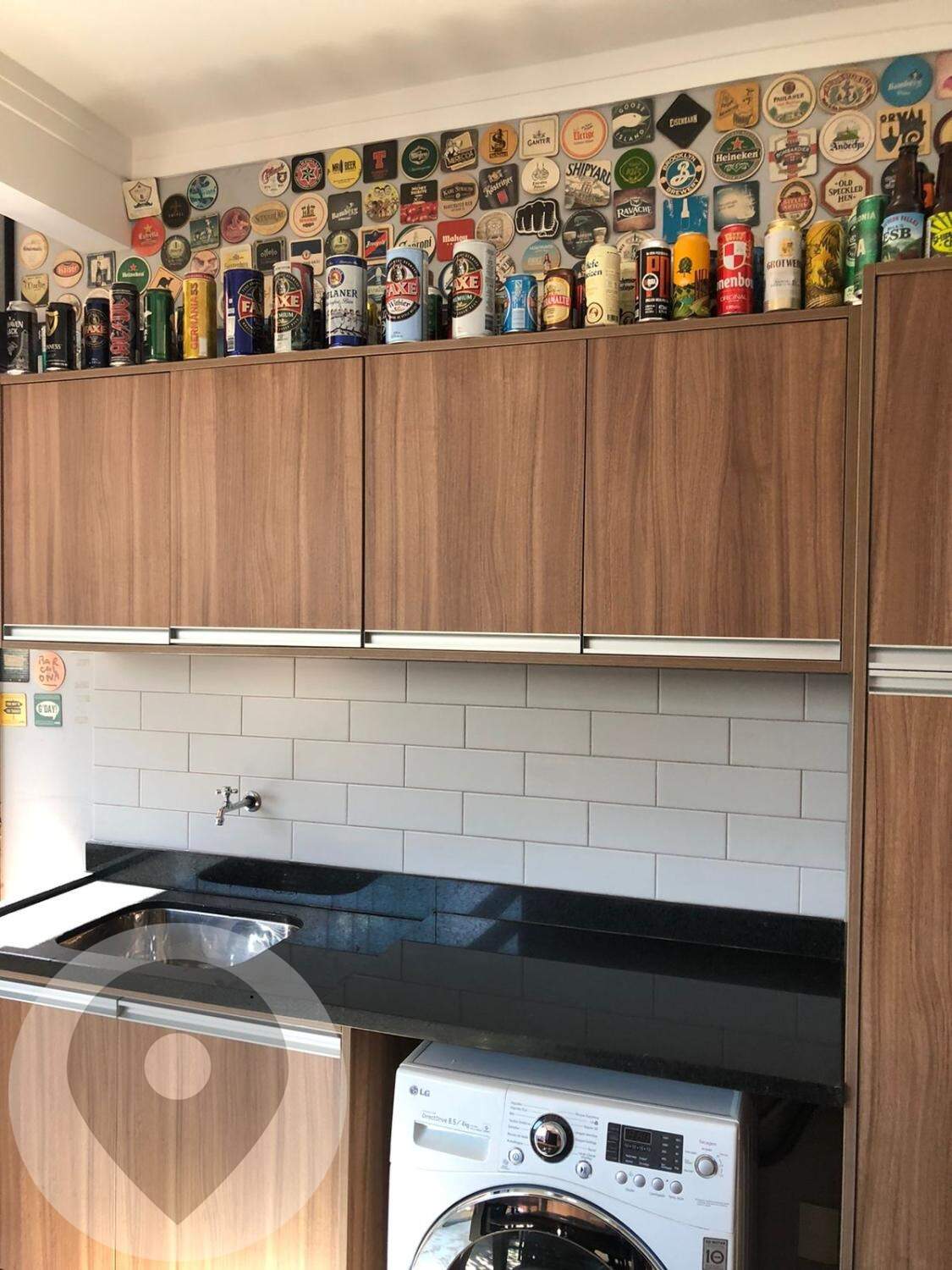 Área de serviço com tanque instalado, com torneira normal, churrasqueira pré-moldada e alvenaria com acabamento, pia em granito preto com 1 cuba de inox, torneira mono comando, armário em MDF madeirado sob a pia;