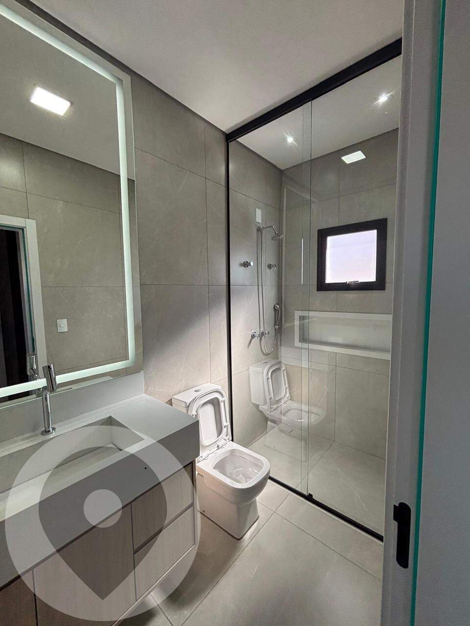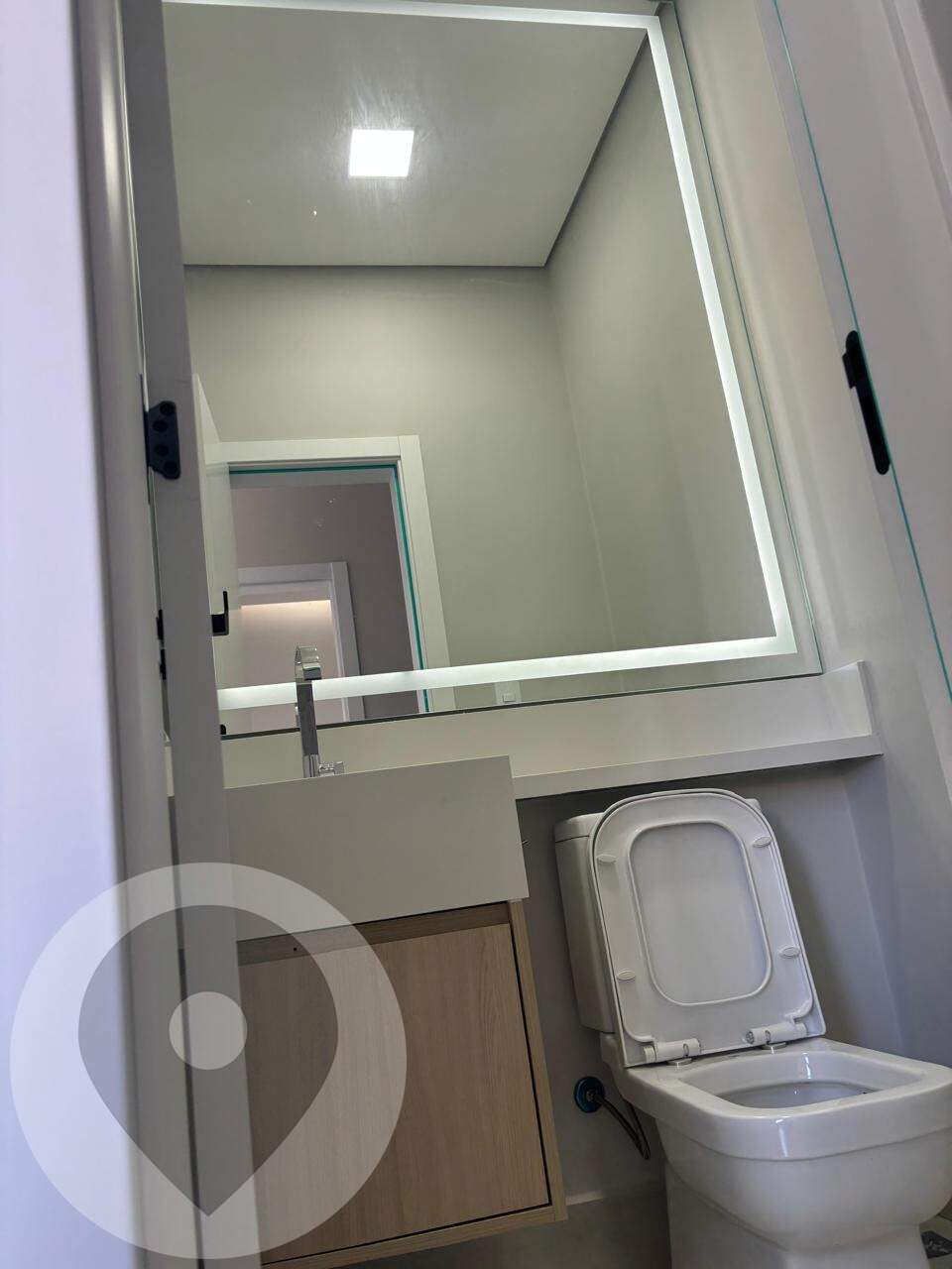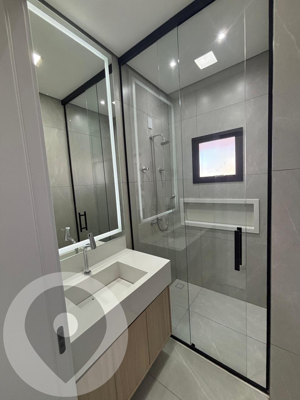 Lavabo e 4 banheiros completos, todos com box de vidro temperado até o teto e espelhos com iluminação de LED.