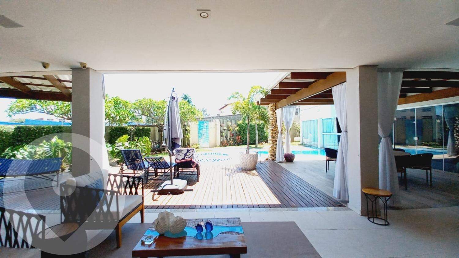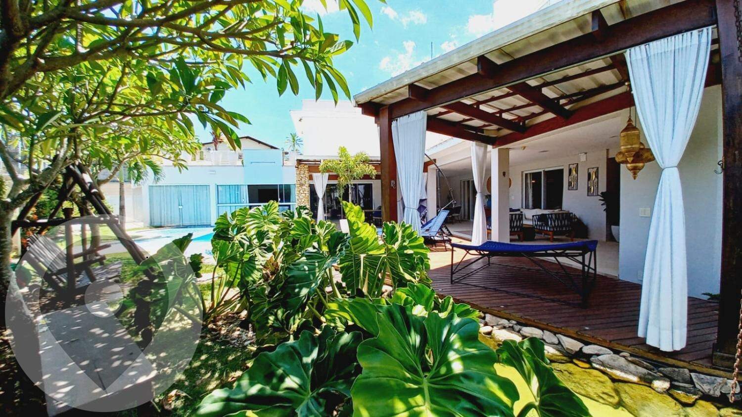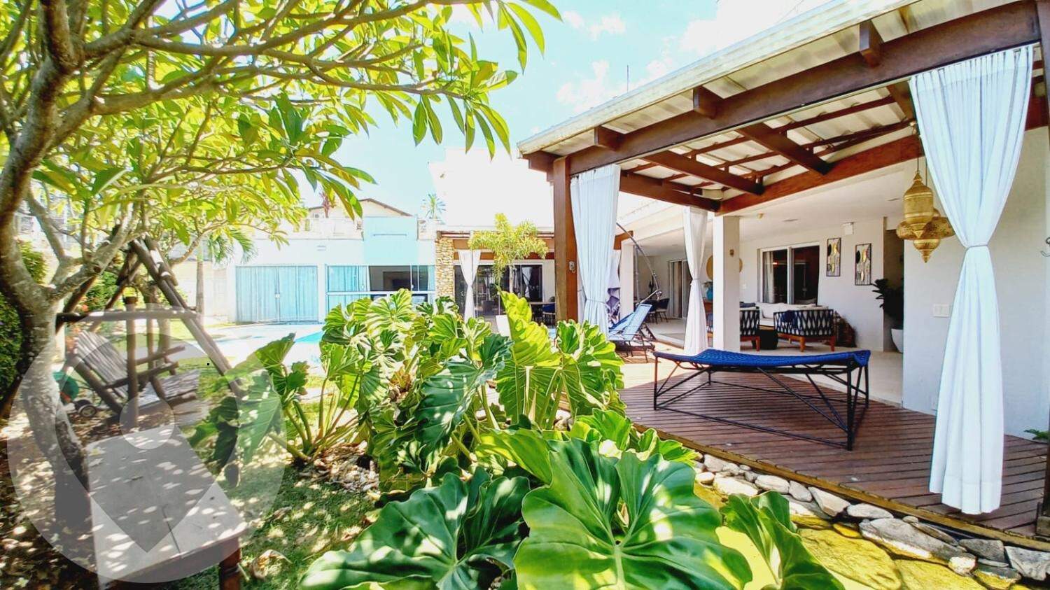 No piso superior, há um banheiro social e três dormitórios, sendo duas suítes, todas avarandadas. A suíte master é impressionante, com mais de 50m², um amplo banheiro com duas duchas e hidromassagem, um enorme closet com varanda e um espaçoso quarto com uma grande varanda voltada para o quintal, que possui um deck de madeira e um espelho d'água.