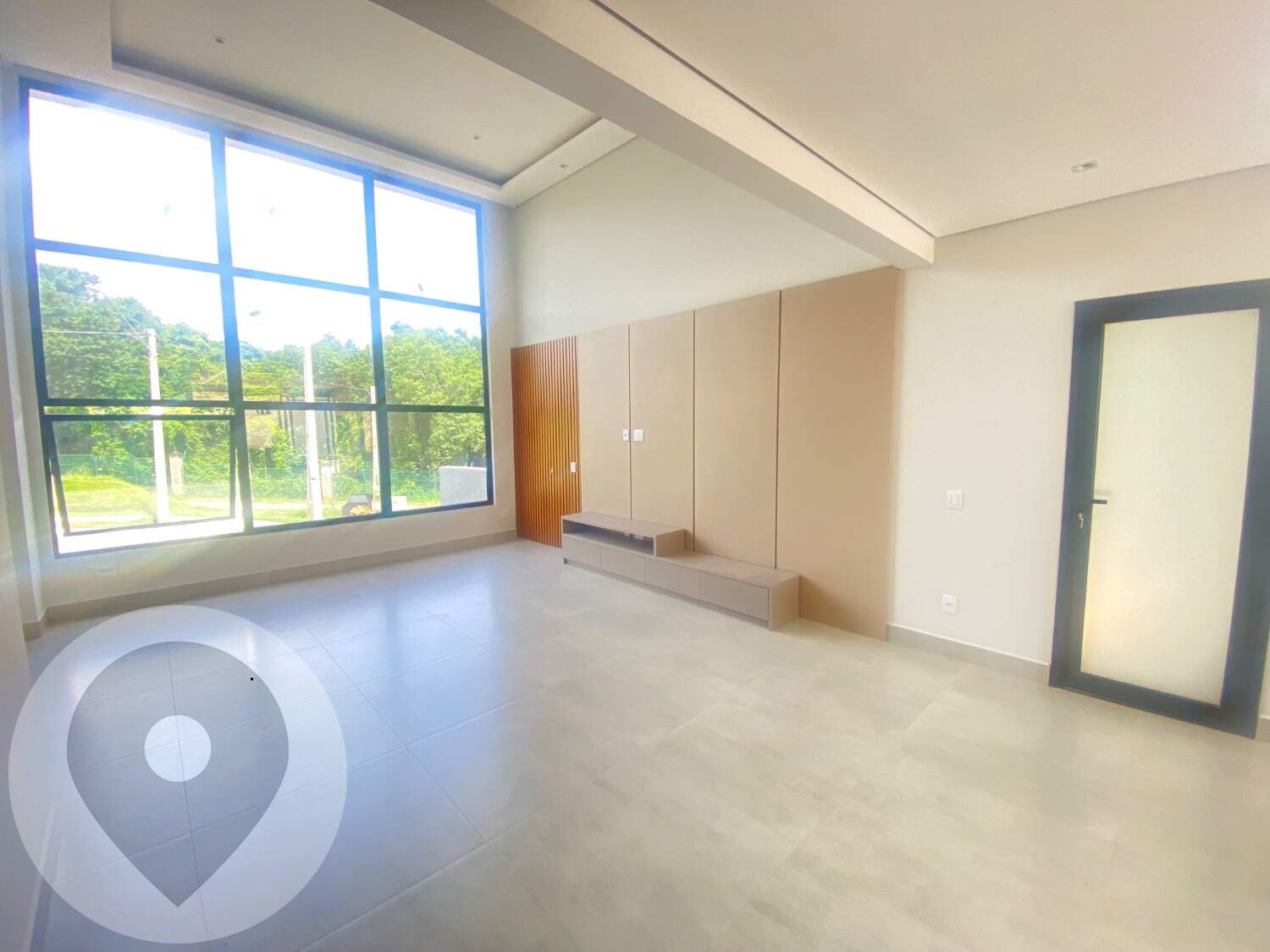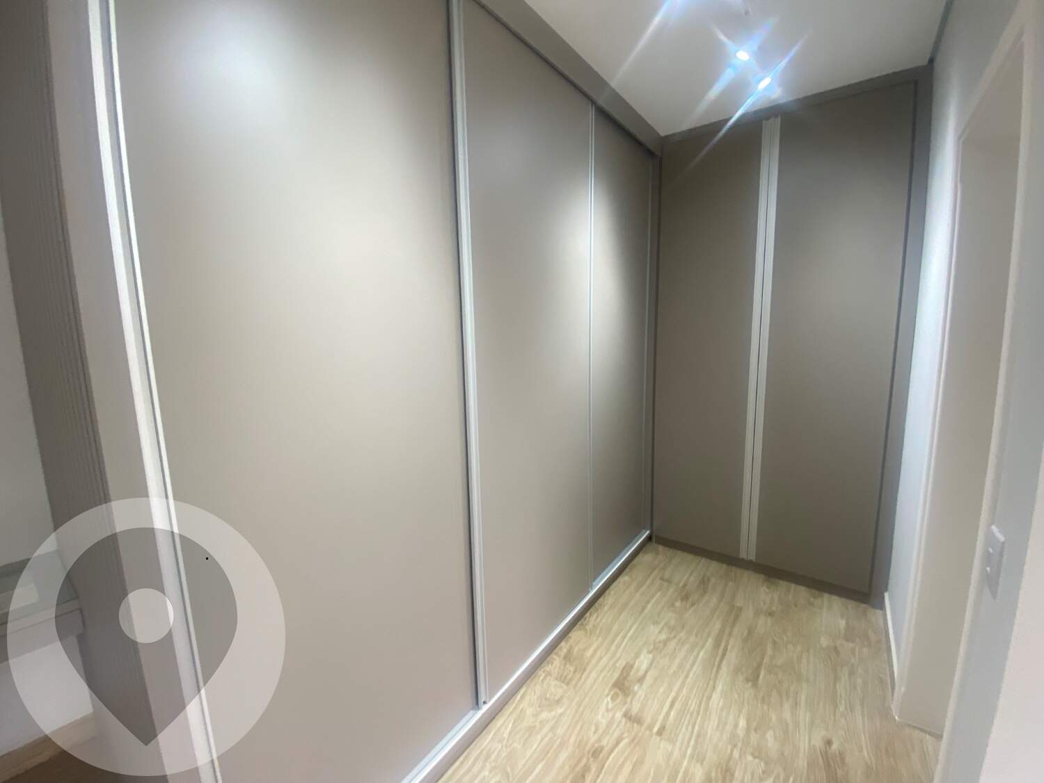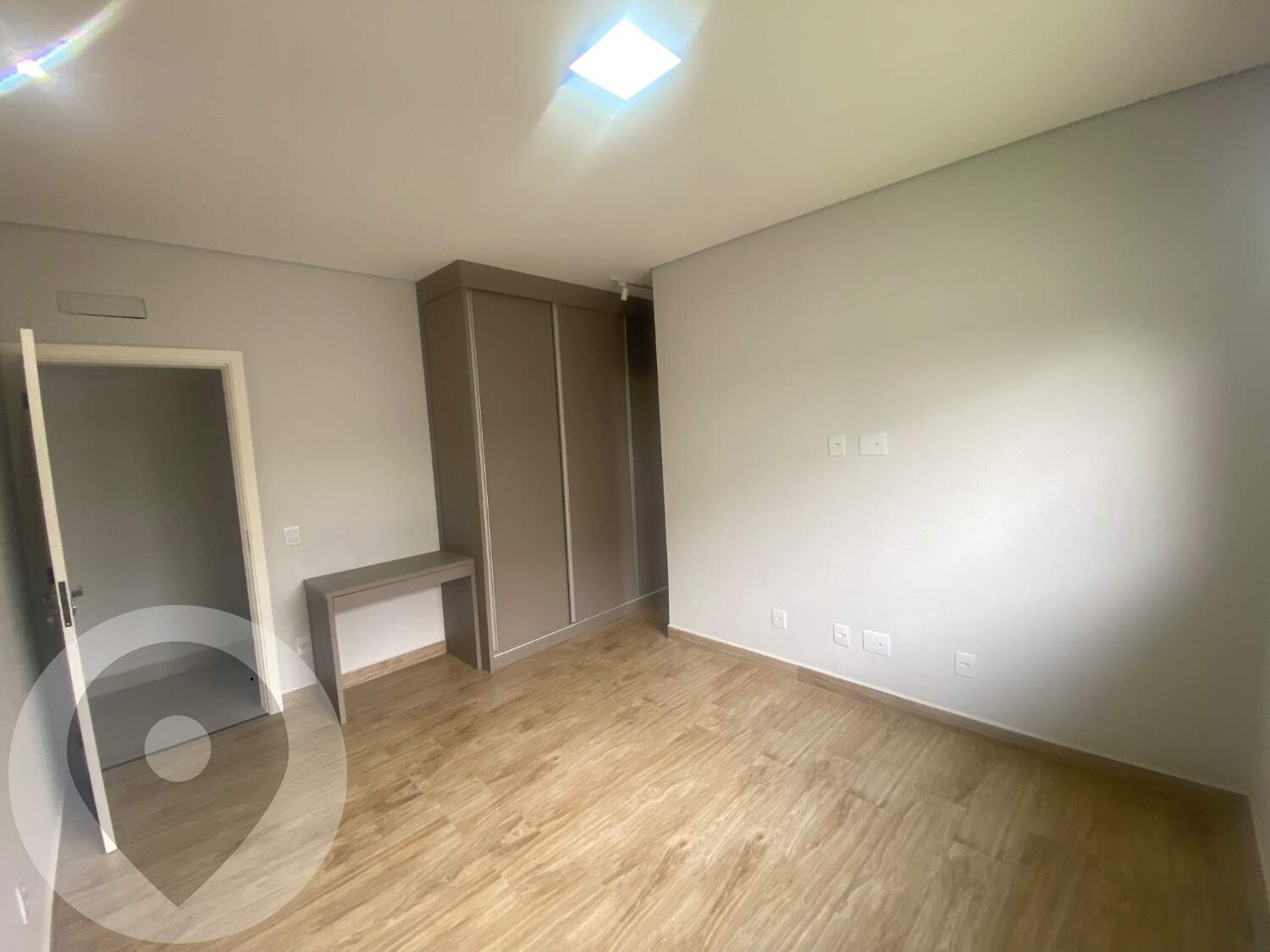 Piso em porcelanato e armários planejados em diversos cômodos.