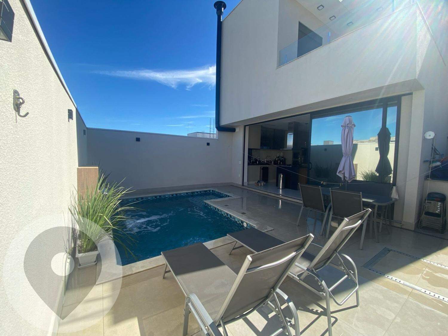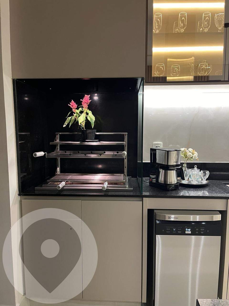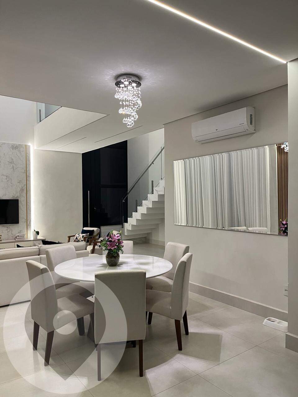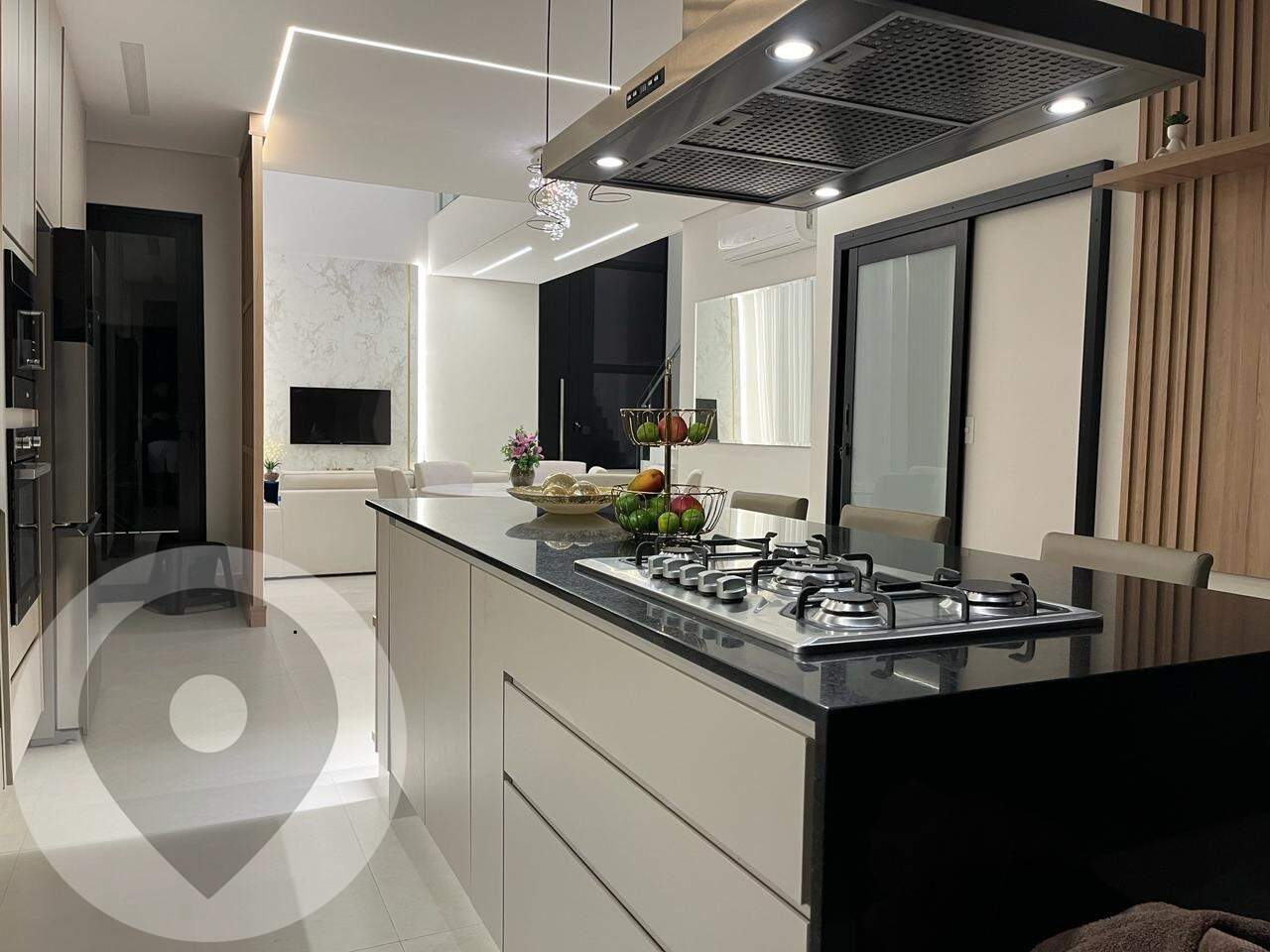Projeto moderno, sala com pé direito alto(com ar condicionado LG DUAL INVERTER 24000 BTUs), passarela, persianas automatizadas, cozinha gourmet com churrasqueira integrada, Ilha com cooktop e coifa, torre quente com forno elétrico e microondas, móveis planejados( com detalhes em LED, mini spots, rack TV ripado etc).