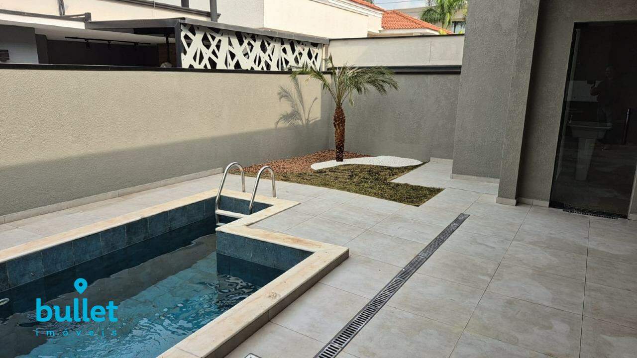 A casa é composta por sala para 2 ambientes (equipada com aparelho condicionador de ar) conjugada com cozinha (equipada com móveis, fogão, forno elétrico e depurador de ar), lavabo, 3 dormitórios sendo 1 suíte (com armários embutidos) e mais 1 banheiro para atender aos outros 2 dormitórios (todos os dormitórios equipados com aparelhos condicionadores de ar). Área de Serviço, churrasqueira, piscina e banheiro para atender à piscina. 4 vagas de garagem.